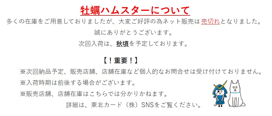多くの在庫をご用意しておりましたが、大変ご好評の為ネット販売は売切れとなりました。 誠にありがとうございます。 次回入荷は、秋頃を予定しております。 【!重要!】 •次回納品予定、販売店舗、店舗在庫など個人的なお問合せは受け付けておりません。 ※少しでも皆様に早く商品をお届けする為、ご了承頂けますと幸いです。 •入荷時期は前後する場合がございます。 •販売店舗、店舗在庫はこちらでは分かりかねます。 詳細は、東北カード(株)SNSをご覧ください。 @tohokucard ご当地ハムスター三陸カキバージョンでございます! カキをモチーフにしたとってもユニークなハムです。 大事そうに抱えているレモンが特徴です♡ 1匹でも、複数一緒に飾ってもハムスター好きにはたまらないアイテムです☆ ちょっとしたプレゼントに… デスクのお供に… 手乗りサイズのとっても可愛いマスコットです☆ ※こちらの商品は一部送料を含んだ値段となります。 ※ぬいぐるみは同商品でもサイズの誤差やパーツの配置など、個々に多少の差が生じることがございます。個性としてお迎え頂けますと幸いです。 (※個体をお選びいただくことは出来かねます。) JAN:4983979924378