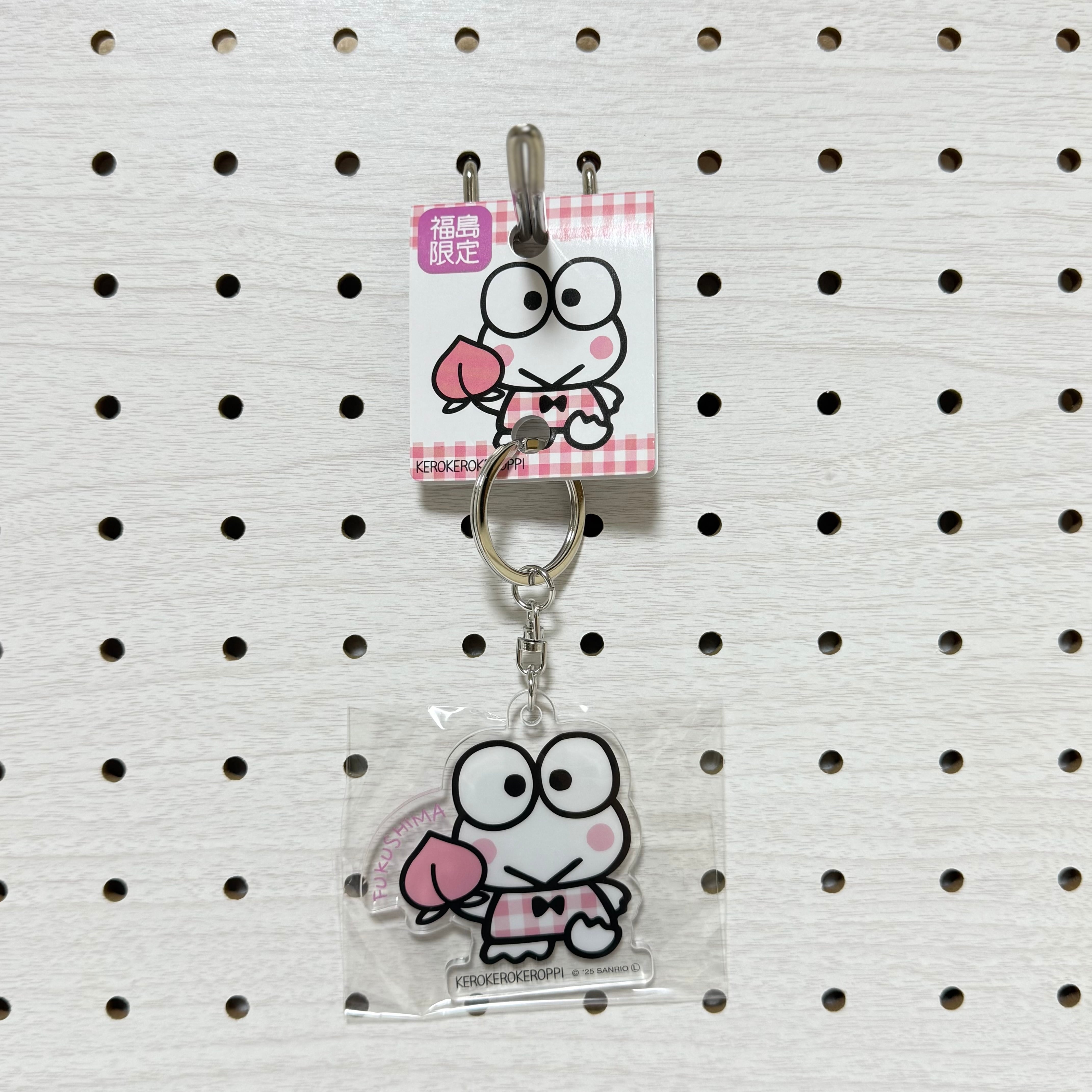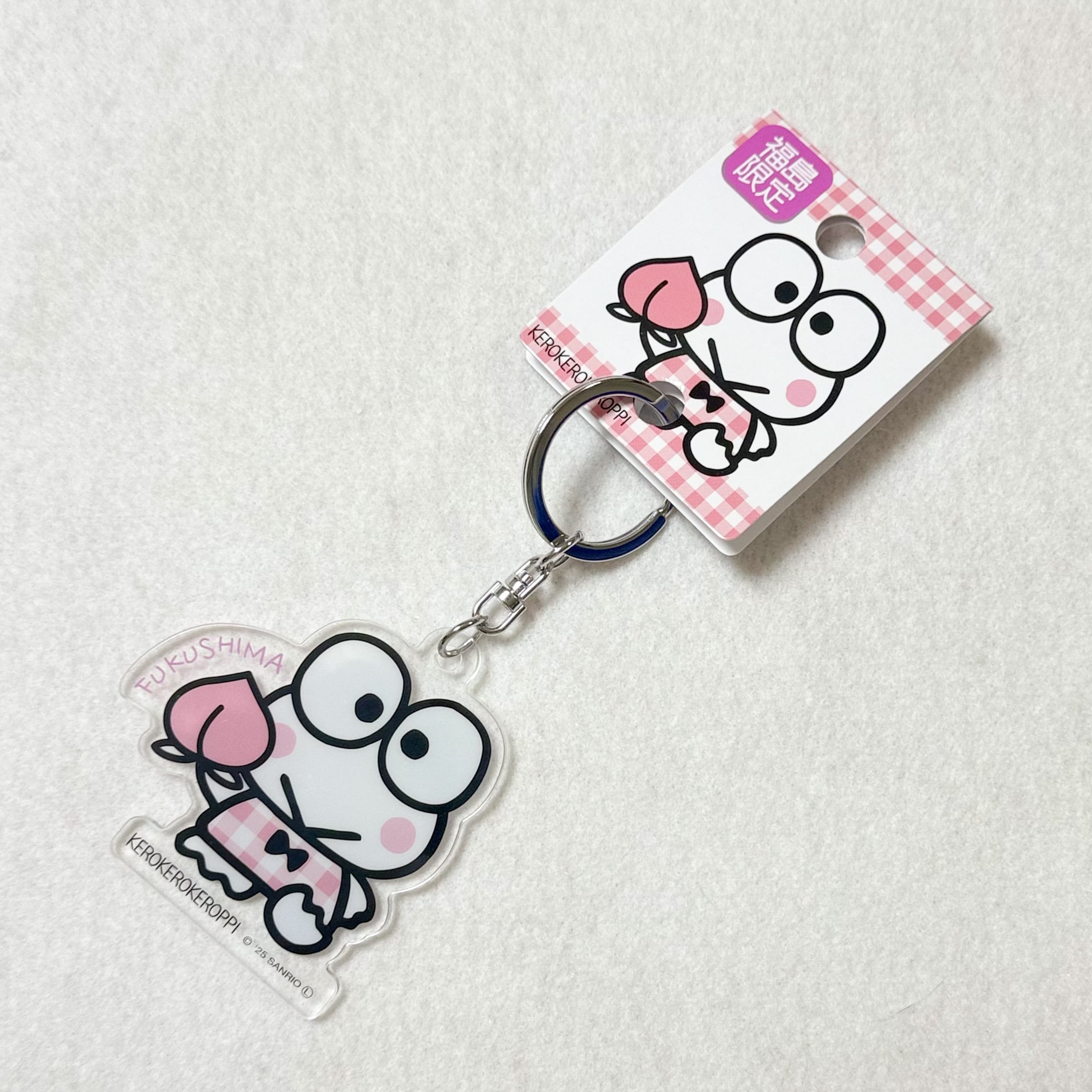 福島名物の桃と、ピンクのチェック柄がかわいく組み合わさったご当地キーホルダーが登場!
