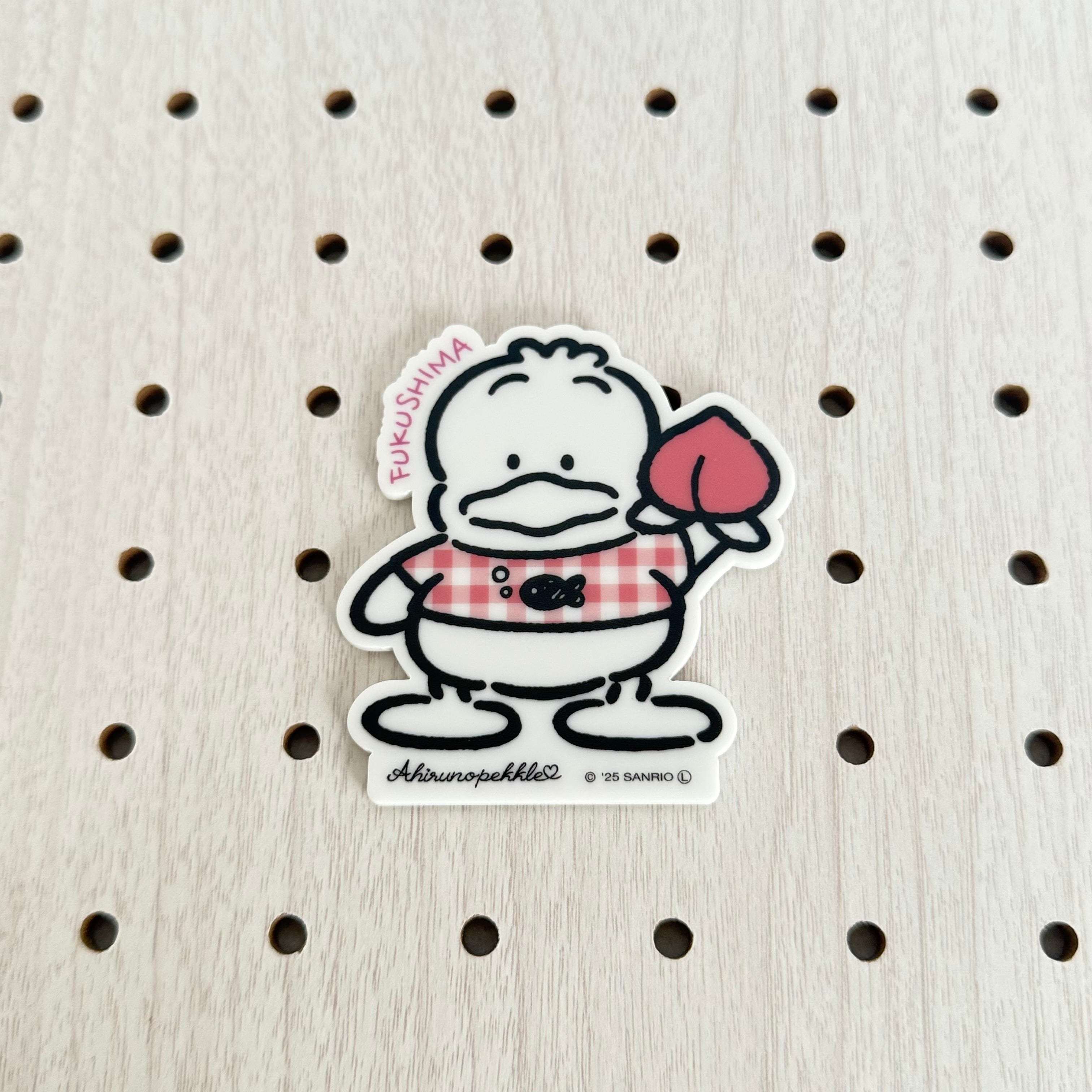 ピンクのチェック柄の服を着たペックルが福島名産桃を掲げているとっても可愛いマグネットです。
