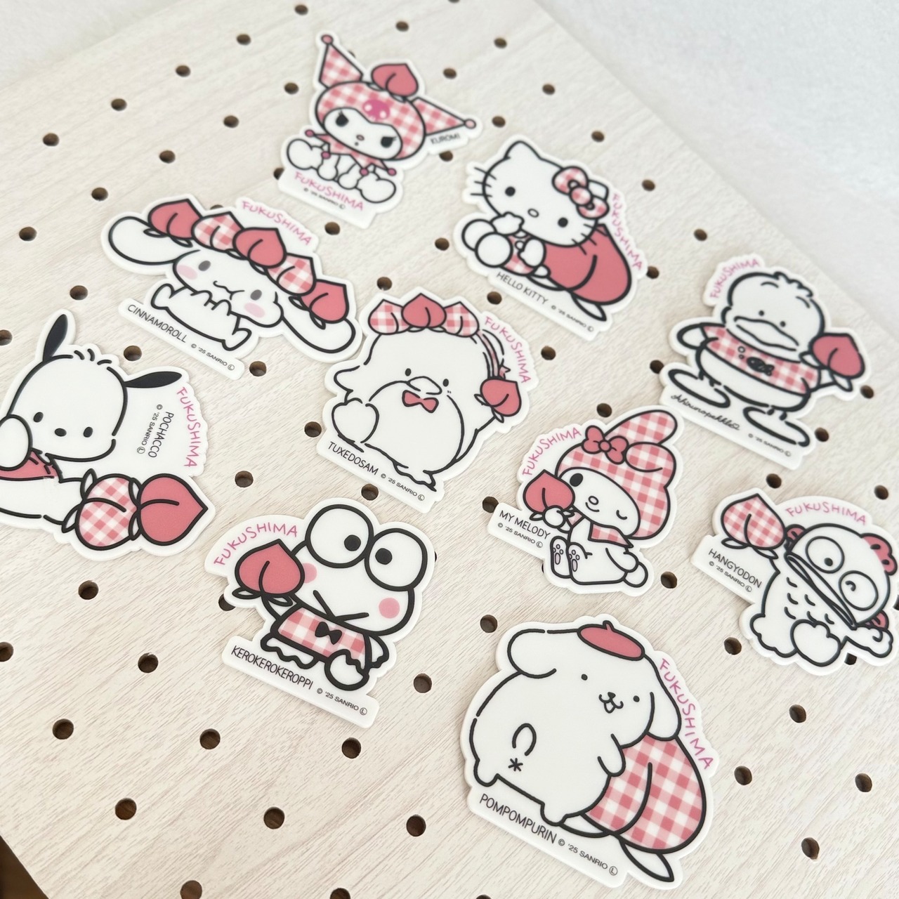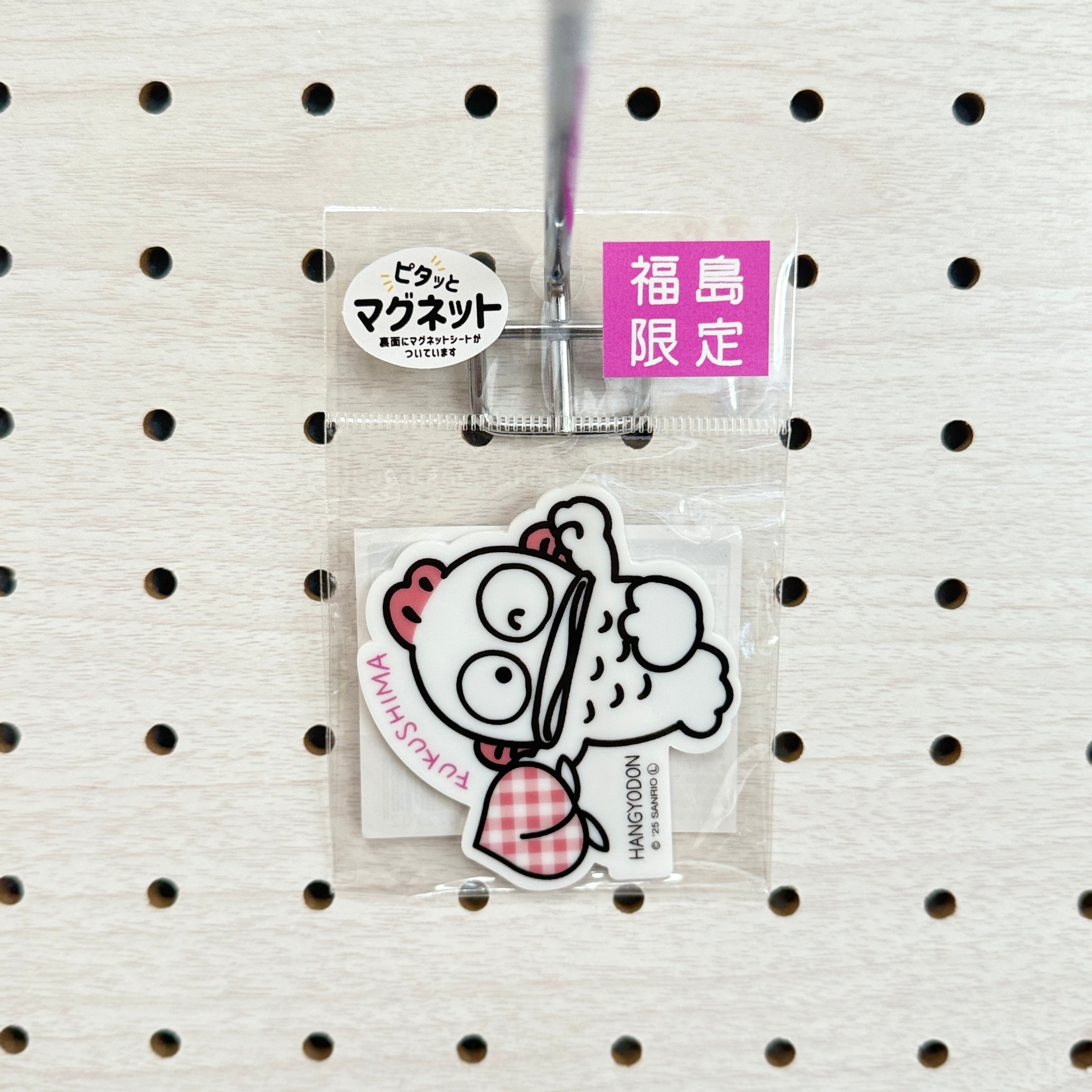 ピンクのチェックの服を着たハンギョドンが桃を掲げているとっても可愛いマグネットです。