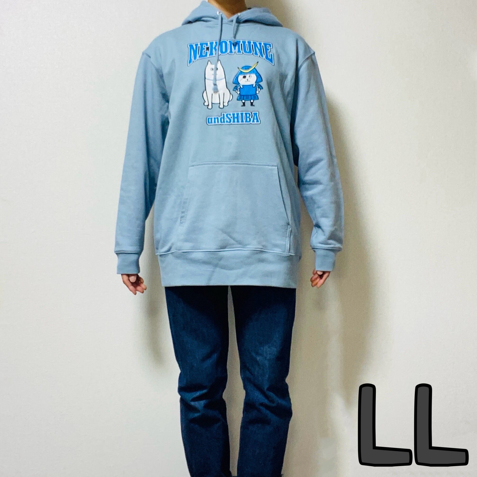 ネコムネとシバのイラストがプリントされたブルーのパーカーです。